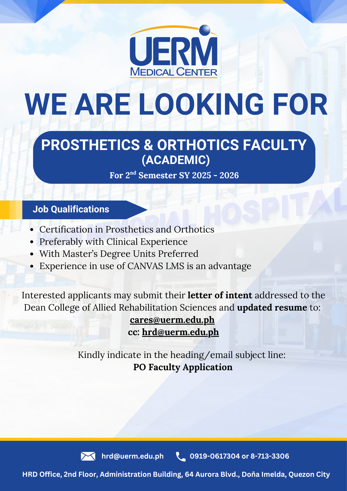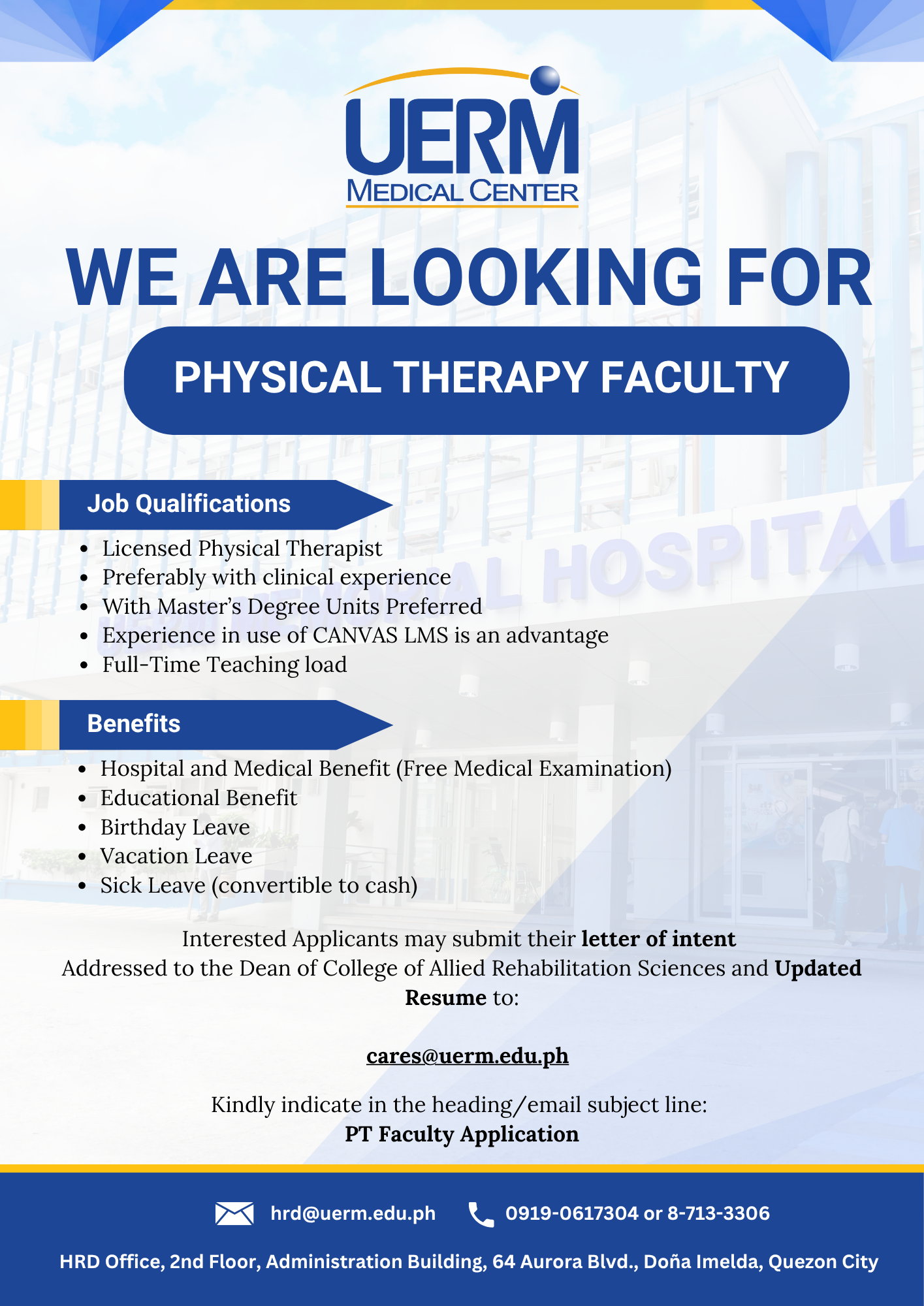 Interested applicants may submit their letter of intent and an updated resume addressed to the Dean of the College of Allied Rehabilitation Sciences to cares@uerm.edu.ph Kindly indicate in the heading/email subject line: